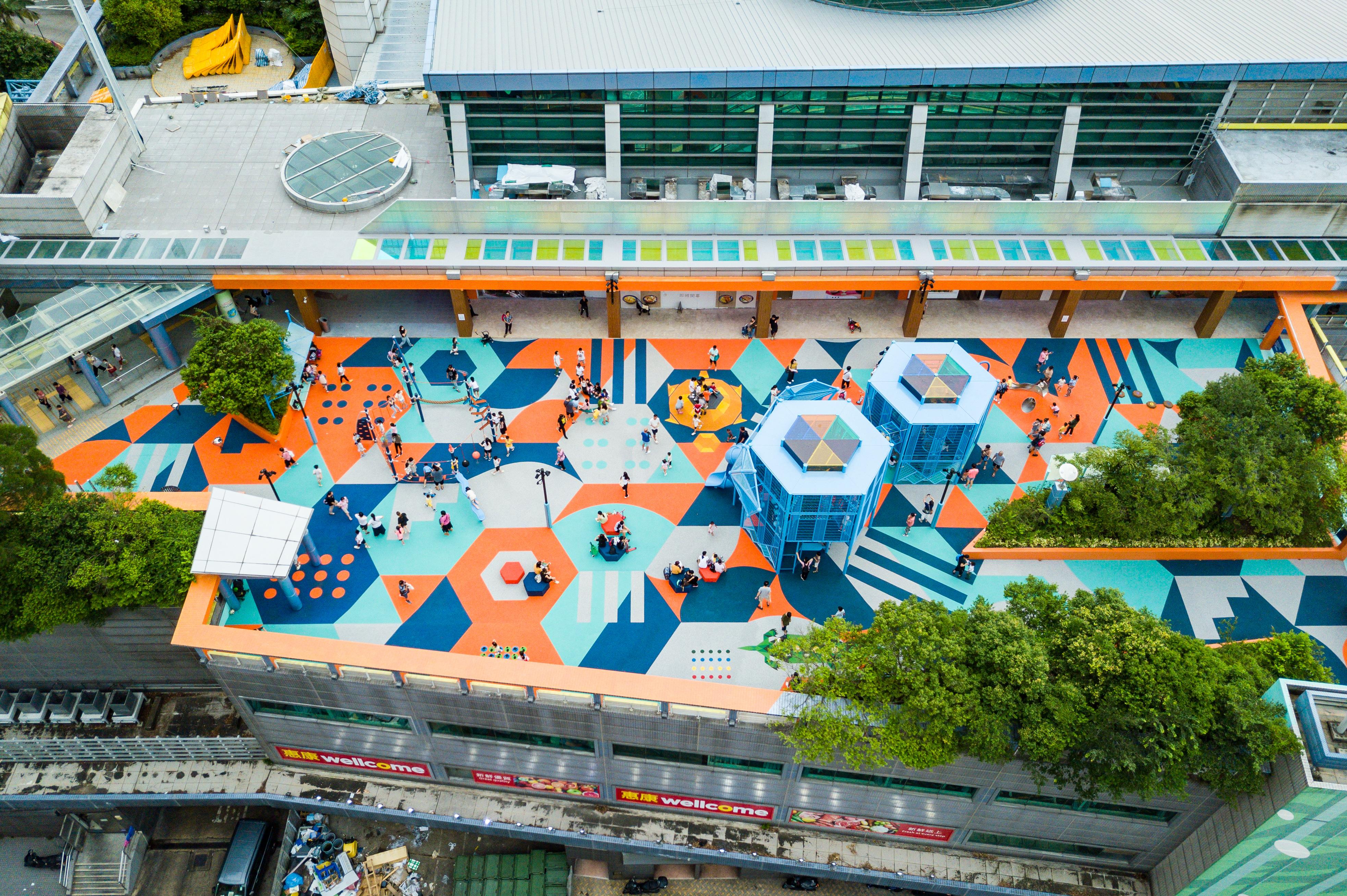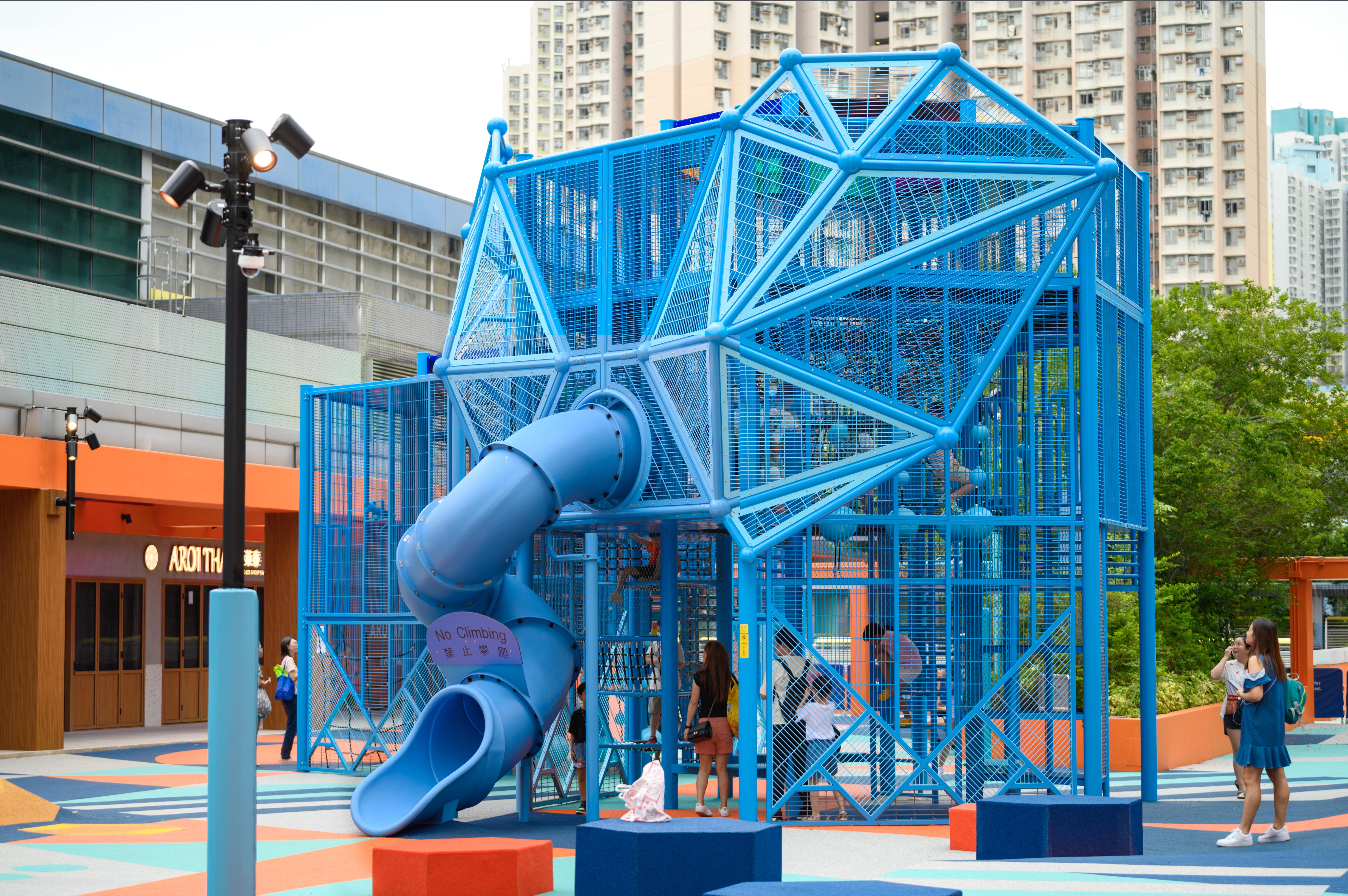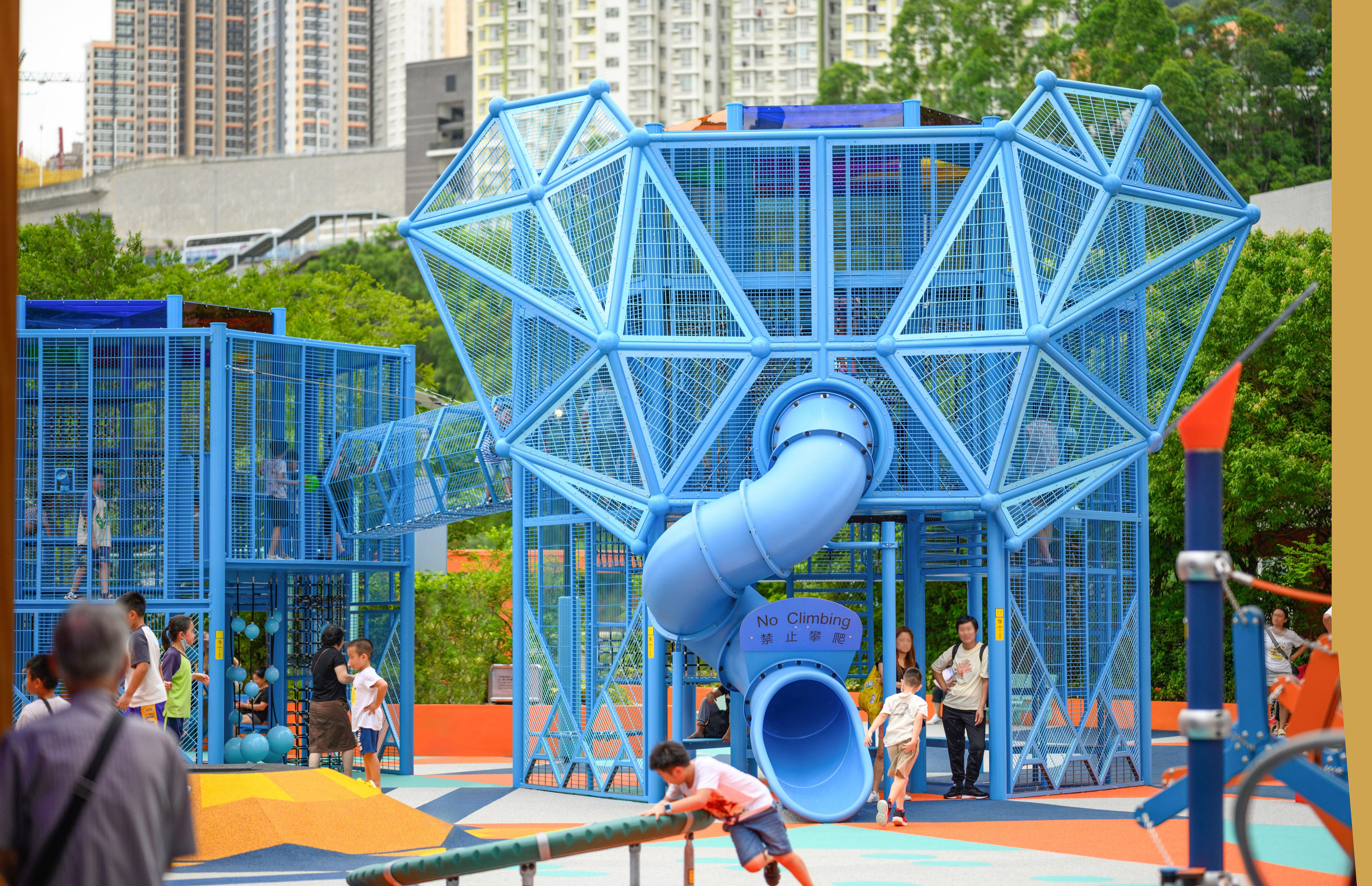 Honored with the German Design Award 2026 - Excellent Architecture, the 12,000-square-foot "Geometric Wonderzoo" in Sau Mau Ping serves as a creative urban oasis for children. This award-winning park features a spectacular 5-metre-tall elephant structure, inviting kids to explore its metal climbing nets and thrilling spiral tube slide.