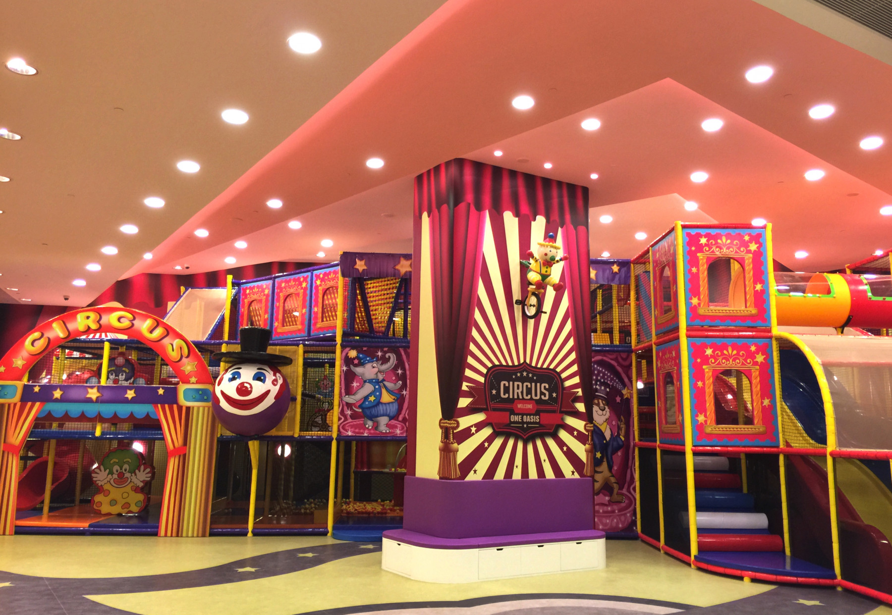 In One Oasis Playroom, there are two different themed play features. One is a large Circus-themed contained play with several slides and tunnels. Another is a castle-themed ball pit which all built-in various play panels.