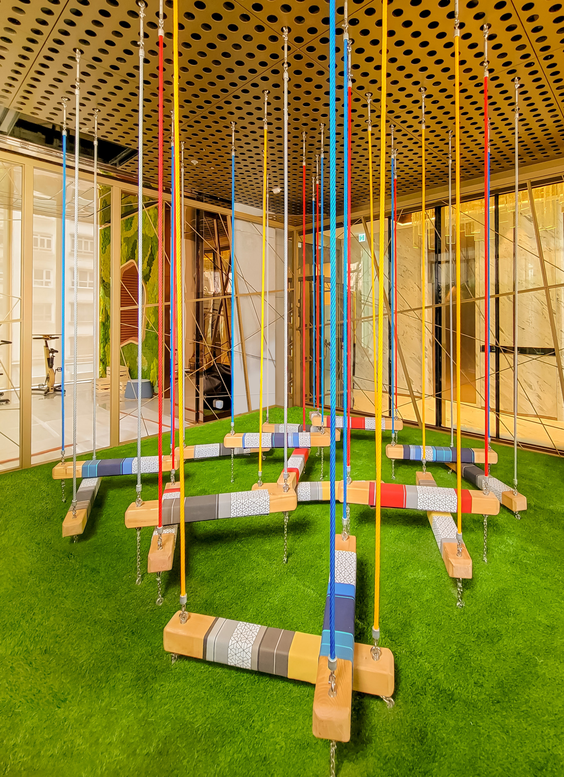 CAINE HILL is a residential project located at No. 73 Caine Road. In Swing Adventure, one of the numerous clubhouse facilities at CAINE CLUB, the designer broke with convention in the creation of eye-catching swing chairs, a non-traditional form ever made. Besides having multi-colored steel wire ropes hung down from the ceiling, the designer utilized glamorous color combinations on wooden seats that beautifully paired with the ropes.