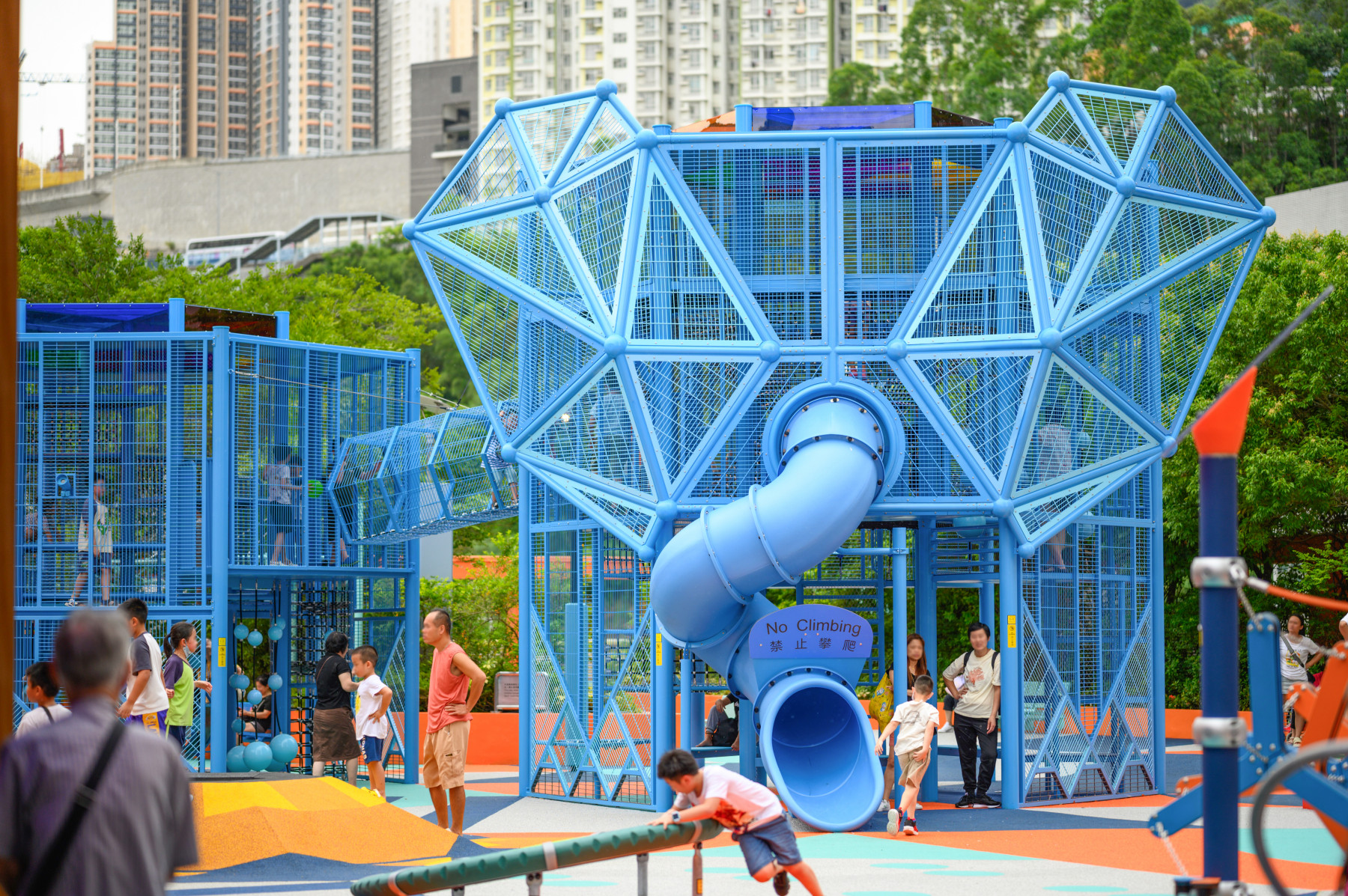 “Geometric Wonderzoo”, spanning approximately 12,000 square feet in Sau Mau Ping, Hong Kong. It is like an urban oasis for children which is creative, fun, artistic and educational. The 5-metre-tall elephant slide is definitely the protagonist among the many "playable animals". Its ears and body are a metal play structure with ropes and nets, while its trunk is a spiral tube slide for children to feel the joy of sliding after climbing, and complete an imaginative and fun experience.